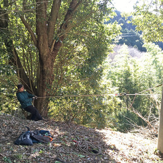 壁面のいちばん上へロープをぴ~んと張りめぐらして、トラバース(横断)ラインを設置し、それに頼っての除草&伐採作業をおこないました。