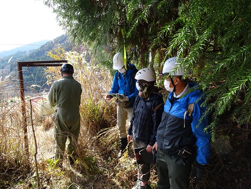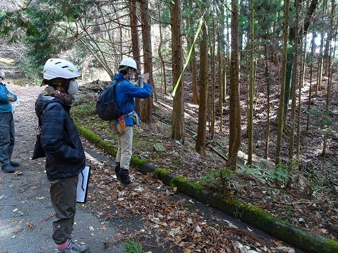 手法としては、とてもカンタン。私たちが申請し、採用された「森林・山林多目的機能発揮対策交付金(林野庁)」から派遣して頂く係員の方といっしょに、あらかじめ調べ、標識を示しておいた境界線を歩きながら、約10メートルおきに彼がスマホのアプリで測定していく。
